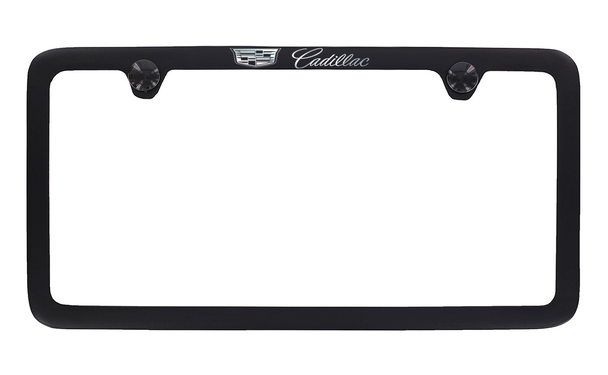 Cadillac Black Coated License Plate Frame in Exposed Chrome Imprint — Thin Rim Frame